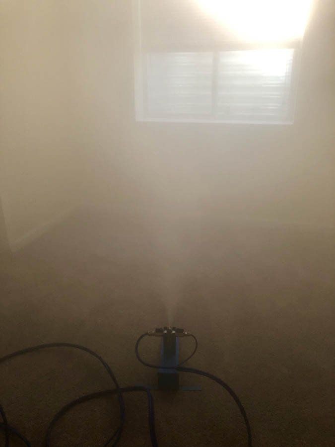 - Second – We treat the remainder of the home or building room-by-room. This is done to build up barometric pressure and relative humidity in each room, invoking the Laws of Thermodynamics. The elevated pressure and humidity, combined with a vapor phase change, will force the dry fog to push into microscopic crevices where mold spores can settle, even when they can't be reached by regular cleaning.